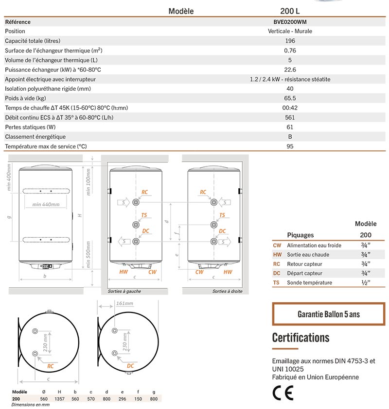 La cuve et l’échangeur sont en acier émaillé. Le ballon est équipé sur le côté de piquages pour le départ et retour du capteur solaire, indépendamment de l’entrée eau froide et sortie eau chaude sanitaire.