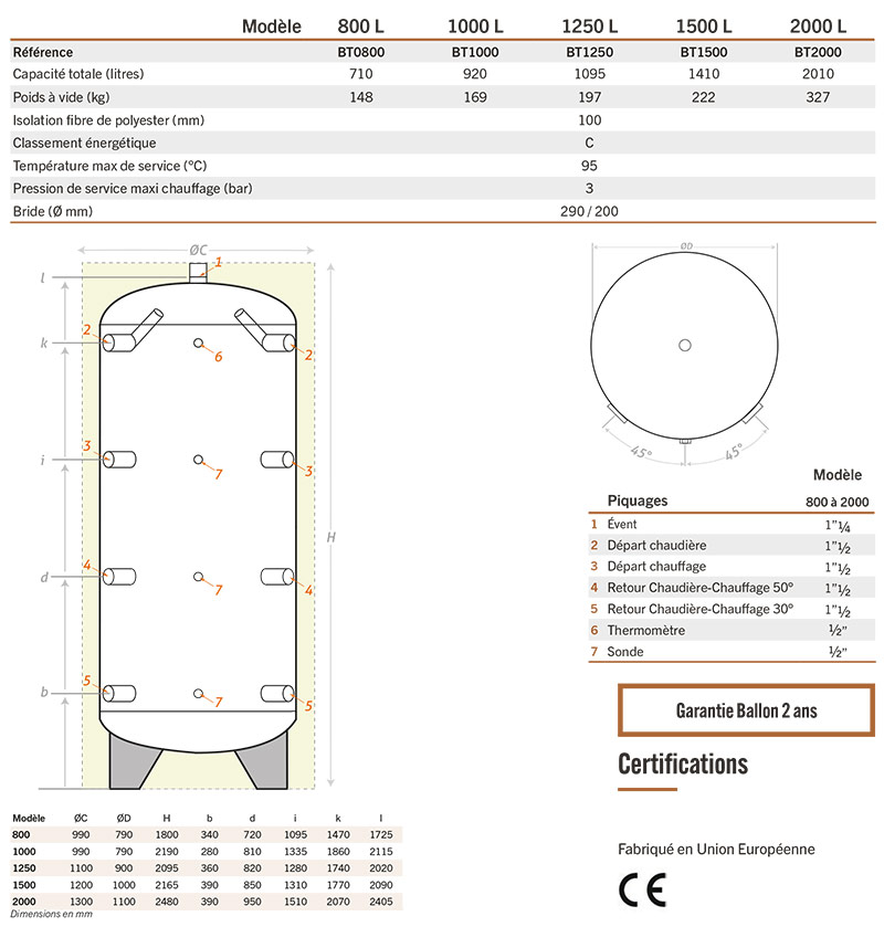 Ces ballons sont constitués d’une cuve en acier noir adaptée au stockage d’eau de chauffage, mais non adaptée au stockage d’eau chaude sanitaire.