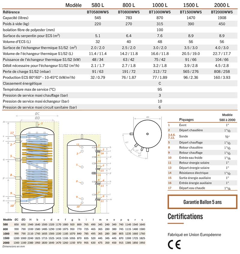 Ballon tampon double échangeur avec production d'ECS BT-WWS 580 à 2000