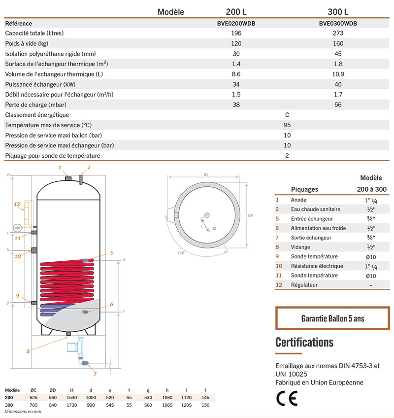 La cuve et l’échangeur sont en acier émaillé. Ces ballons sont à poser au sol.
