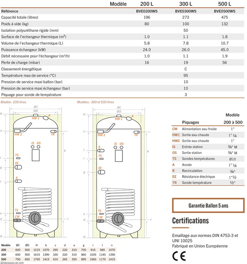 La cuve et l’échangeur sont en acier émaillé. Ces ballons sont à poser au sol.