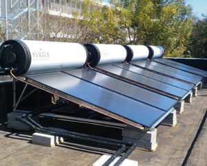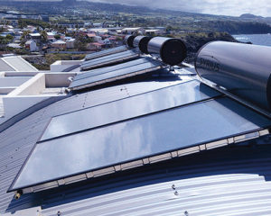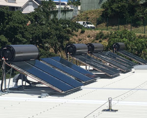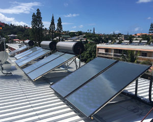 Références, témoignages et expériences en solution solaire collective en zone tropicale. Chauffe-Eau Solaire Thermosiphon installés sur une toiture métallique, collectif Outremer Syrius Solar