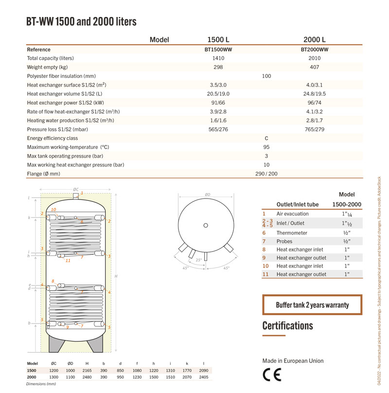 Buffer tank BT-WW 1500 to 2000 - Double heat exchanger