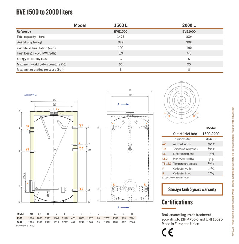 DHW solar storage tanks BVE 1500 to 2000