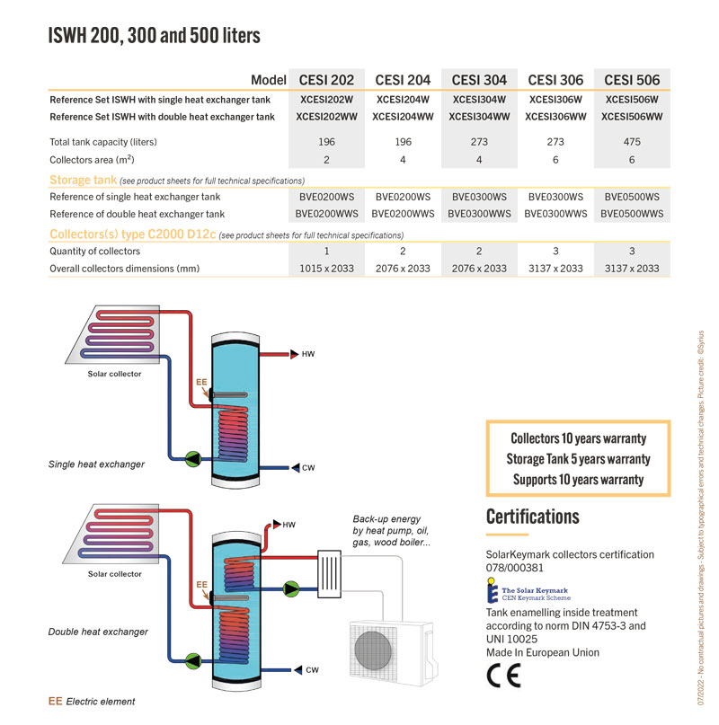The storage tank can be supplied with back-up energy through an electric resistance, a heat pump or other boilers (gas, oil, wood).