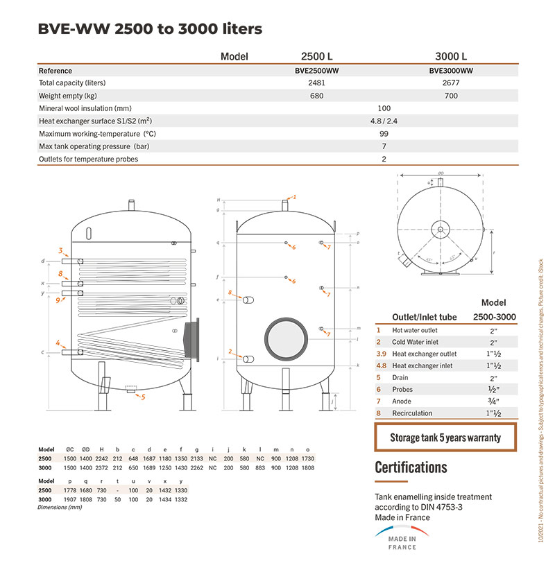 These tanks are to be placed on the ground, and are generally used in combination with solar production (on the bottom heat exchanger) and back-up by a boiler or heat pump (on the top heat exchanger).
