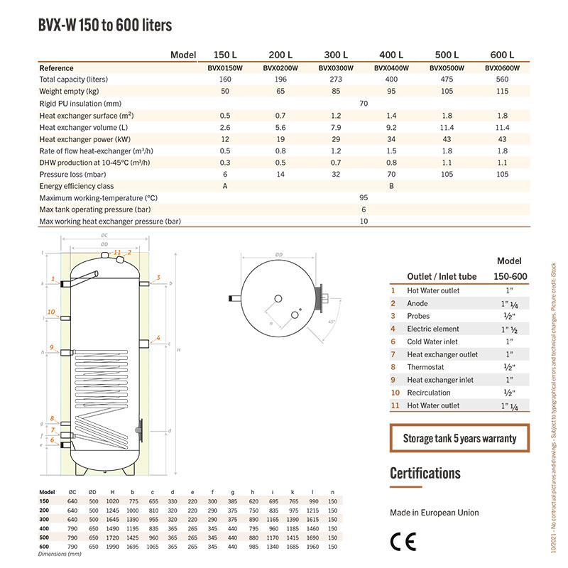 The BVX-W series tanks are specially designed for primary circuit solar systems. They are equipped with a heat exchanger.