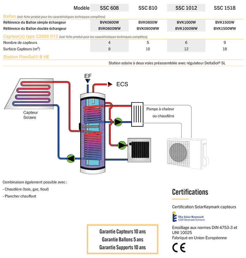 Le système comporte une station équipée d’un régulateur qui pilote le circulateur solaire et le ou les circulateurs chauffage. Le complément d’énergie peut être apporté par une chaudière d’appoint (gaz, fioul, bois), par une PAC ou une résistance électrique.